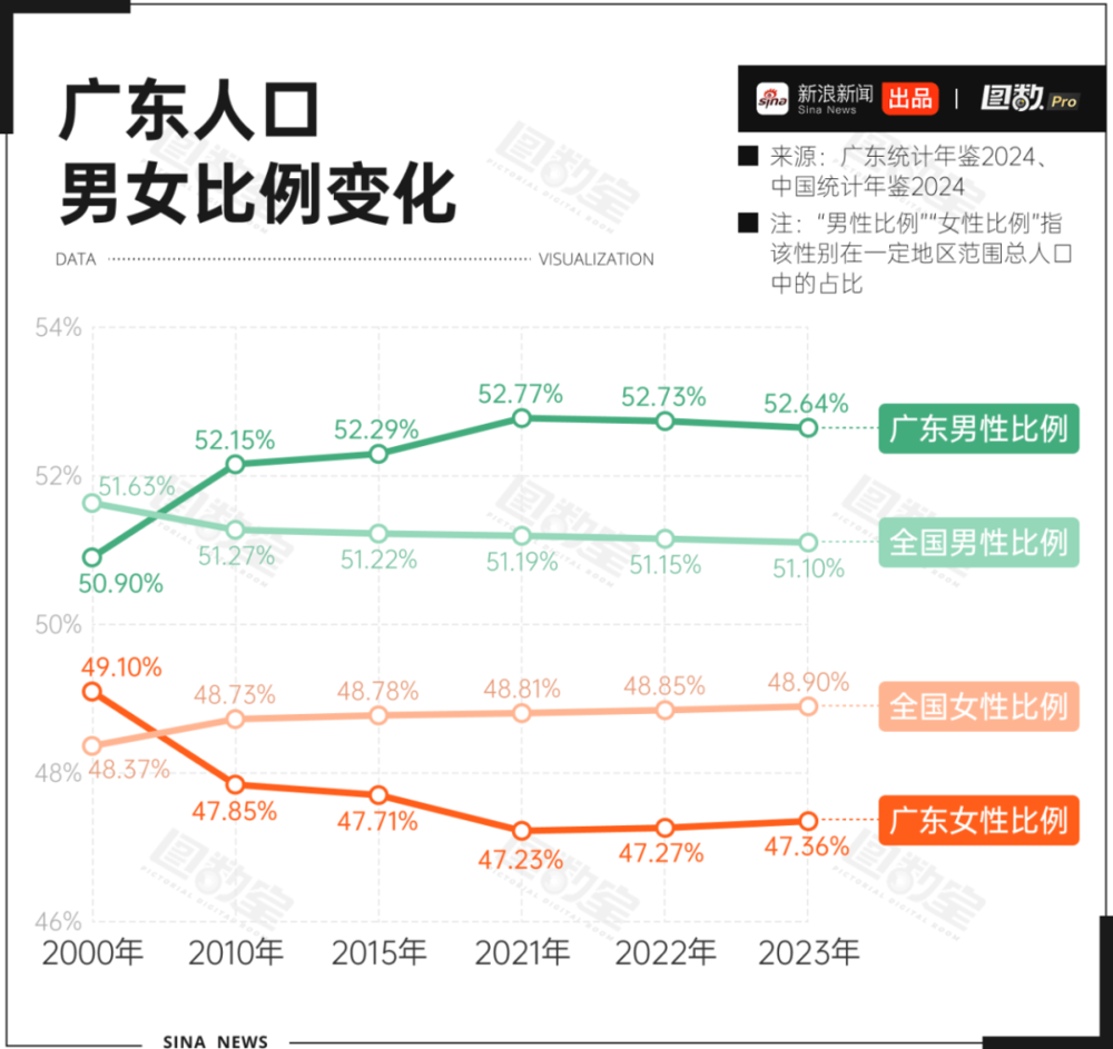 从近20年的数据来看,广东男性比例始终“领跑”,从2000年50.9%涨到2023年的52.64%,和全国性别比逐渐靠拢的趋势正好相反。