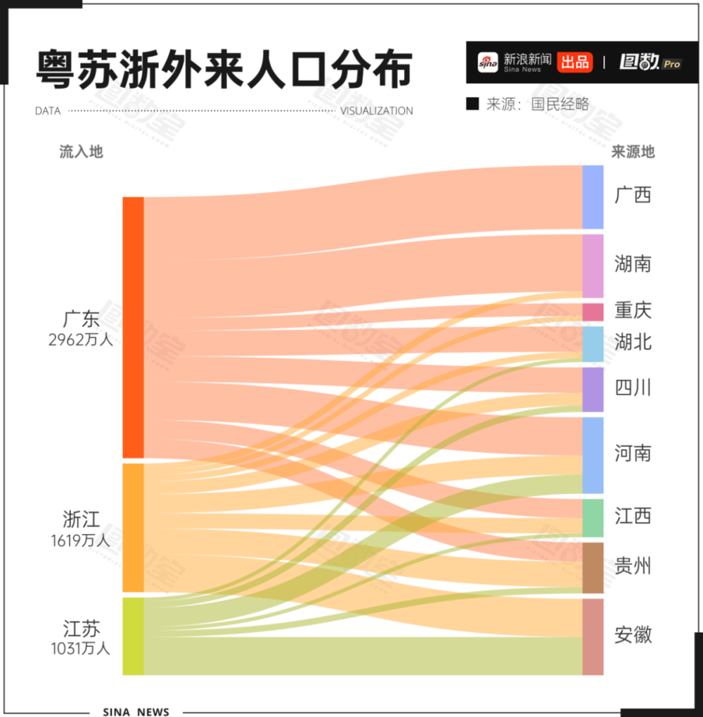 广东外来人口不只数量众多,并且来源分布广泛。其中,来自广西、湖南的双双超过500万人,而河南、湖北、四川、江西、贵州均超过200万人。