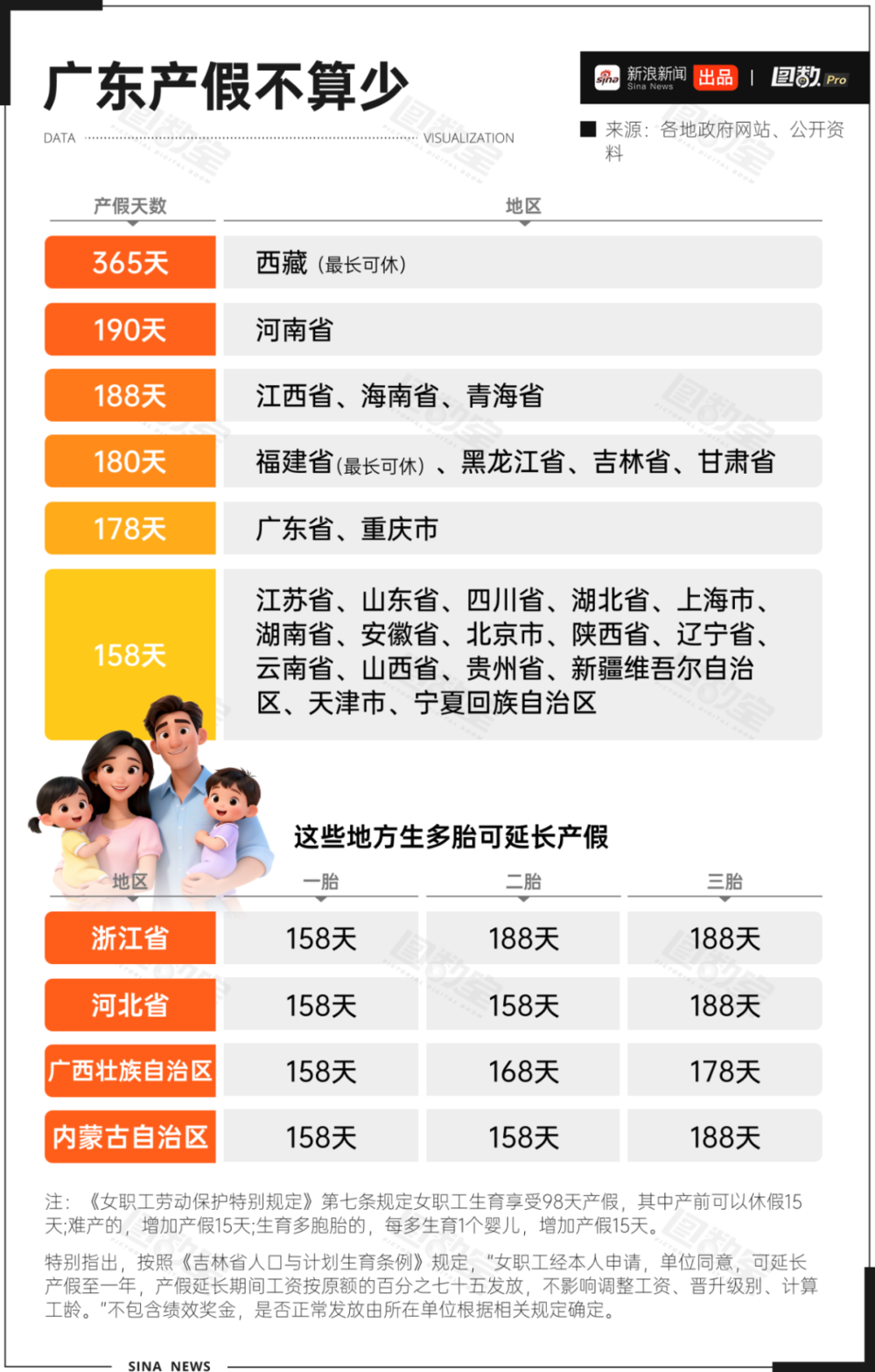 全国统一执行98天的标准产假,在此基础上,各地都会相应增加延长。广东的产假就位于第二梯队,长达178天。