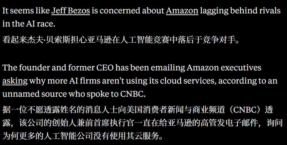 据报道,贝索斯近期频繁给公司高管发邮件,追问“为什么越来越多AI初创公司不选我们AWS”,他忧心忡忡地指出亚马逊在AI云服务上的脆弱处境,明显流露出对“AI算力之战”落败的担忧。