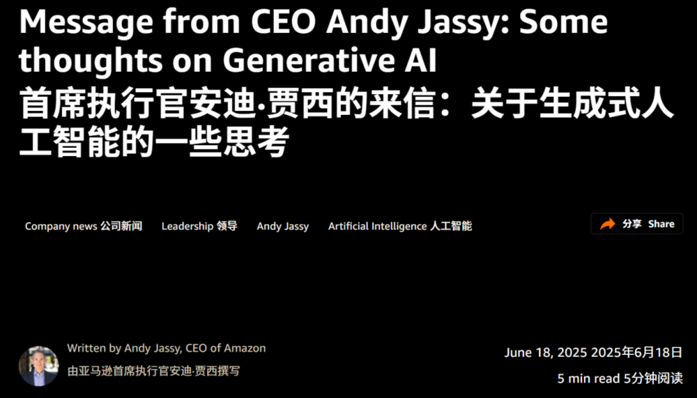 在今年6月的一封员工信中,他更预告道:“未来几年,我们的公司白领人数将因AI而缩减”。