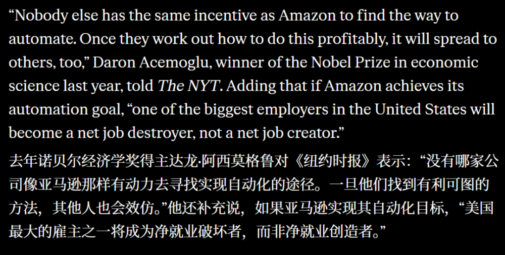 正如麻省理工学院的诺贝尔经济学奖得主达龙·阿西莫格鲁所警告的那样,如果亚马逊的机器人计划如愿的话: