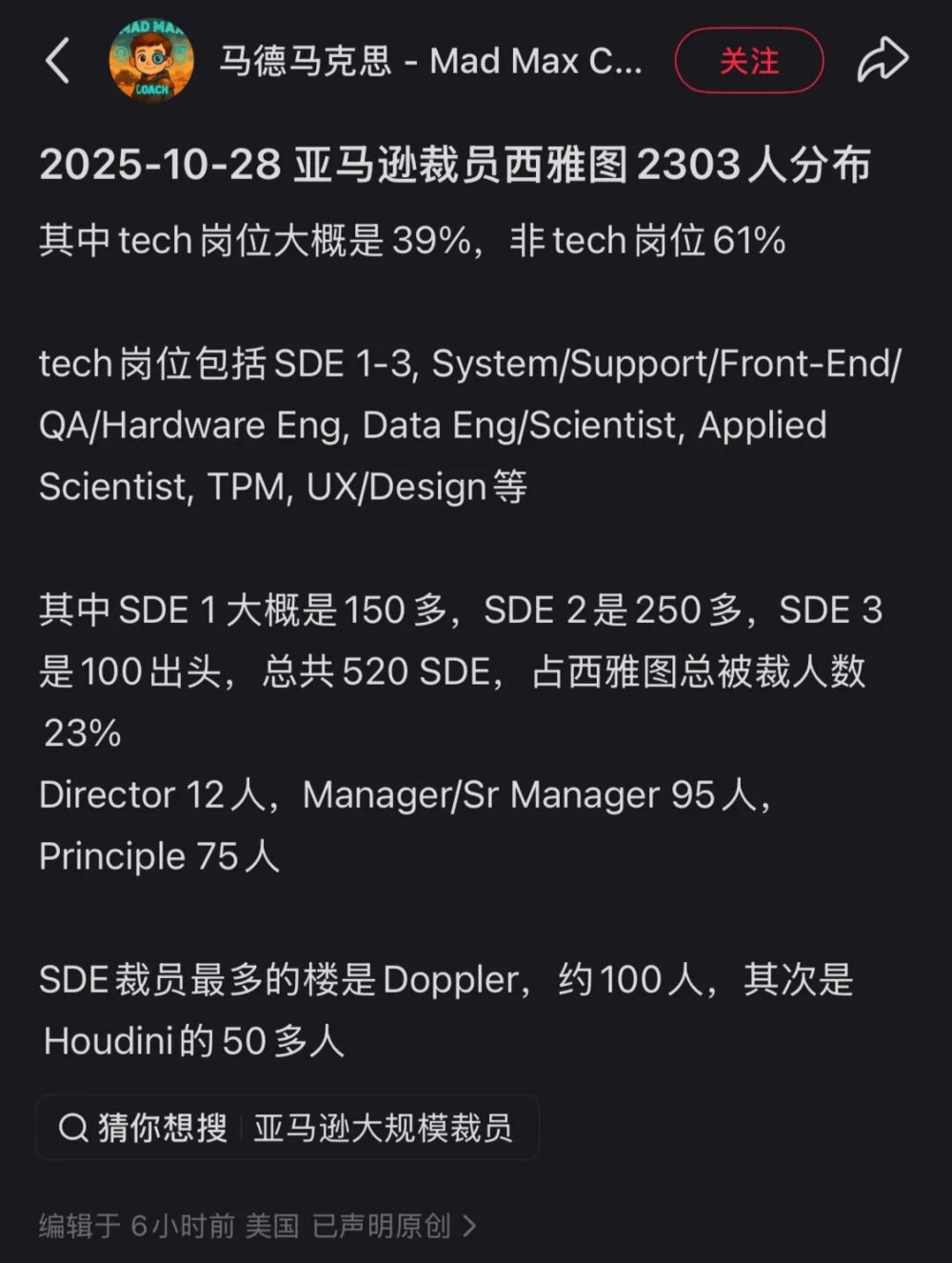 如果说AI对中层员工构成了无形压力,那么亚马逊此次裁员更直接、也颇具戏剧性的一幕是:连中高层管理者也未能幸免于“刀俎”。