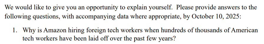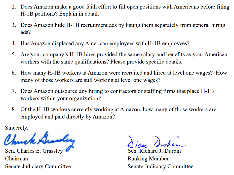 来自两党的一封国会质询信直接点名质问CEO贾西:“你们是不是在利用H-1B机制引入更廉价、易控制的劳动力来替代美国员工?”