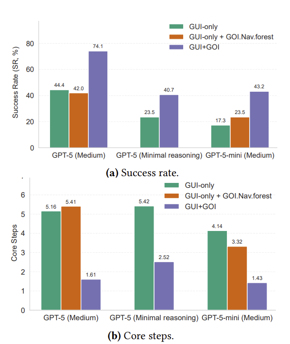 结果显示,GOI带来了压倒性的性能提升。在使用GPT-5推理模型的核心设置下,成功率从44%飙升至74%。