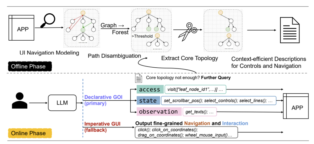 第一步:离线“绘制地图”。在离线阶段,GOI会自动探索目标应用(如Word)的可访问控件,分析点击前后界面元素的变化,从而构建出一张完整的“UI导航图”(UI Navigation Graph)。