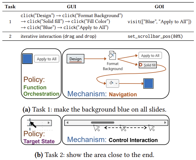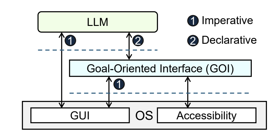 这就是这项研究的核心思路:将接口从“命令式”转换为“声明式”(Declarative)。为此,研究团队基于GUI和操作系统的可访问性机制,提出了一个全新的抽象——声明式接口(GOI)。