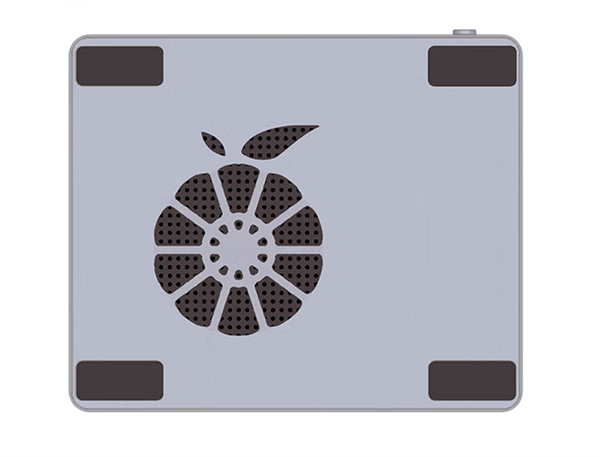 这个银灰色的小盒子外壳是金属材质,长宽高尺寸分别只有207.7毫米、132.6毫米、40毫米(脚垫高8毫米),比很多迷你机都要小,底部设有两个进风口。