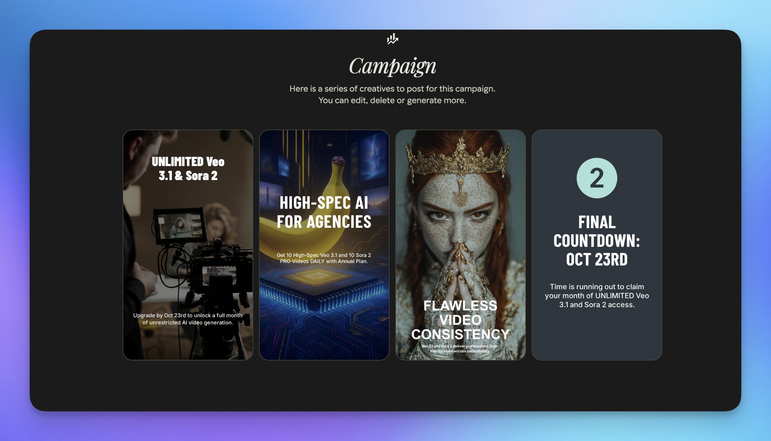 当你觉得上面的信息没问题的时候你就可以点那个「looks good」然后进入到生成页面了,他会在下方根据你的品牌 DNA 生成几个用于预览的设计稿。