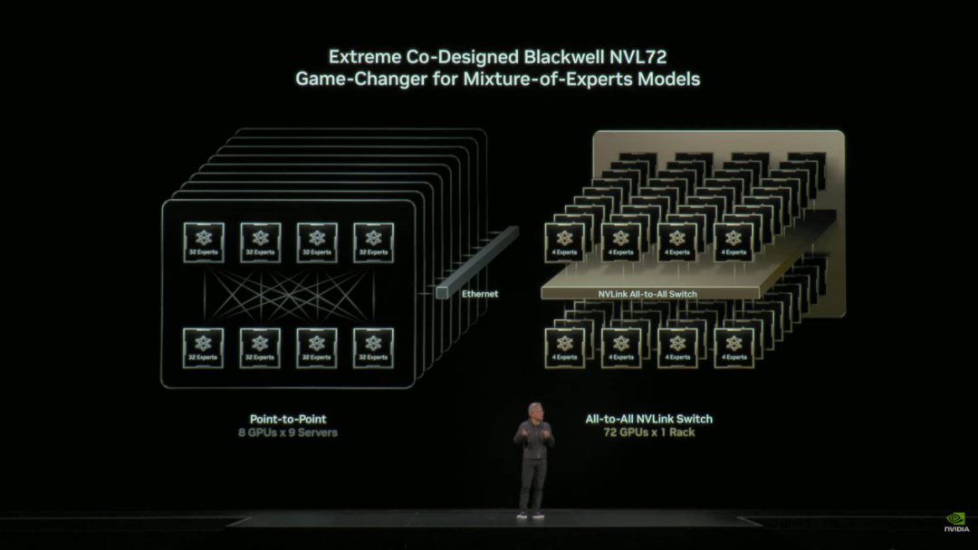 因此,这个价值数万亿美元的巨型AI 模型汇聚了众多不同领域的专家。我们将所有这些不同领域的专家都集中到一个 GPU 上。现在,这是 NVLink 72。我们可以把所有芯片都集成到一块巨型晶圆上,每位专家都能相互交流。因此,这位首席专家能够与所有在岗的专家进行交流,以及所有必要的上下文、提示和我们必须处理的大量数据,一堆tokens,我们必须发送给所有专家。专家们会…… 无论哪位专家被选中解答问题,都会随即尝试作出回应。