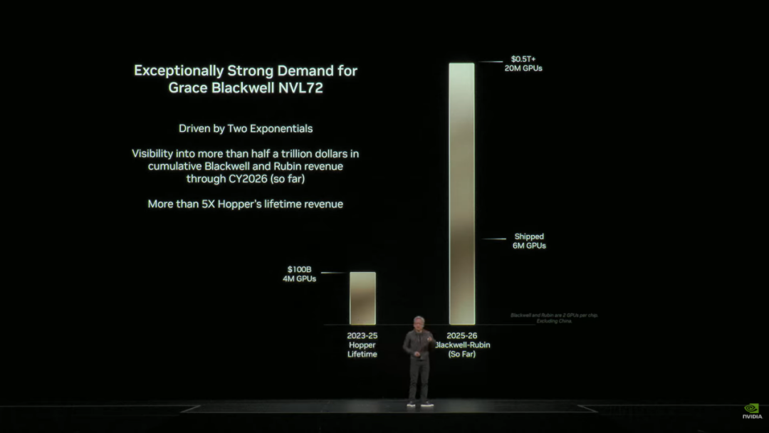 我认为,在Blackwell以及Rubin早期增长态势上,2026年我们很可能是历史上首家能够看到5000亿美元业务规模的公司。正如你所知,2025 年尚未结束,2026 年也尚未开始。这就是账面上的业务量,迄今为止已达半万亿美元。