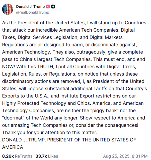图3 特朗普于2025年8月25日在Truth Social平台发布的一条帖文