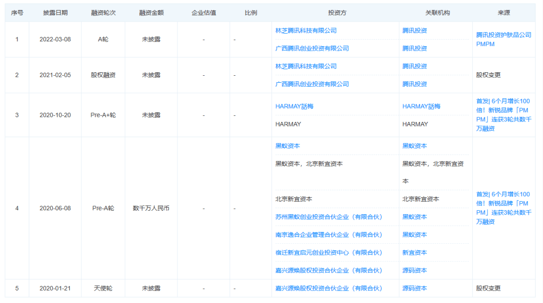 创立不到一年,PMPM便快速完成三轮融资,累计融资金额超1亿元。其股东阵容涵盖专业投资机构(如黑蚁资本、源码资本)、新兴美妆零售机构(如HARMAY话梅),以及互联网巨头旗下投资机构(如腾讯投资)。