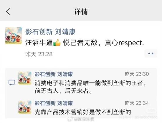 近日,影石创新董事长刘靖康在社交平台发文谈及大疆创新董事长汪滔,表达对其的敬意。他称汪滔是消费电子与消费品领域中唯一实现真正垄断的企业家,成就空前绝后,无人能及。刘靖康同时指出,仅靠产品、技术和营销的优势,并不足以达成如此市场地位。