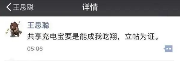 7 年前,王思聪公开在朋友圈骗吃骗喝,直接说,共享充电宝要是能成,直接吃翔。