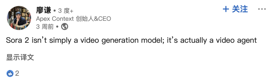 他提到一个典型例子,Sora 2。它的发布不仅再一次证明了OpenAI的野心——不满足于做模型公司,要向产品和平台演进,更重要的是它搅乱了原本的竞争格局。