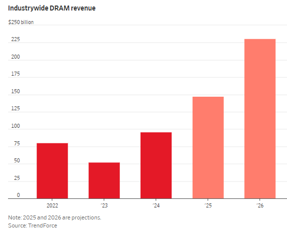 研究机构TrendForce预计,作为存储芯片主要类型的DRAM,明年带来的全行业营收将达到2023年周期低谷时的四倍以上——攀升至约2310亿美元的历史新高。
