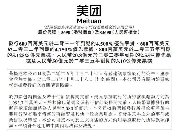 美团于10月29日晚间在港交所发布公告,宣布发行五笔美元及人民币计价的优先票据,合计募集资金超过230亿港元。此次发行所得净额将主要用于现有离岸债务的再融资及满足一般企业运营的资金需求。