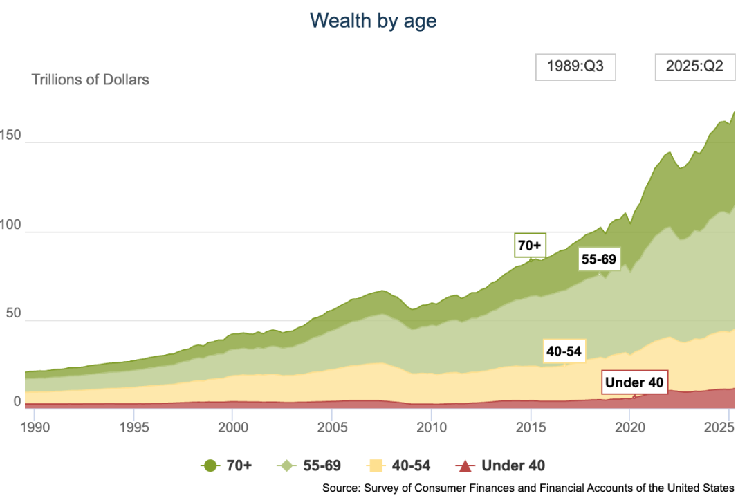 老登们赢麻了,55岁以上人群拥有的总财富占比接近3/4。