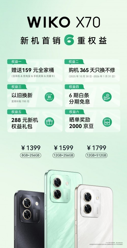 📸 **全能配置:颜值、影像与性能并存。** WIKO X70在核心卖点之外,在颜值、影像和性能方面也毫不妥协。7.59mm超薄机身和180g超轻重量提供了舒适的握持感。后置5000万像素RYYB超感光镜头和前置3200万超清镜头,配合AI美肤和前后同拍功能,满足了用户在不同场景下的拍照和录像需求。搭载骁龙778G芯片,结合内存融合技术,提供了流畅的运行体验。同时,鸿蒙生态加持的AI通话防诈、广告拦截等功能,也为用户提供了更安全的用机环境。