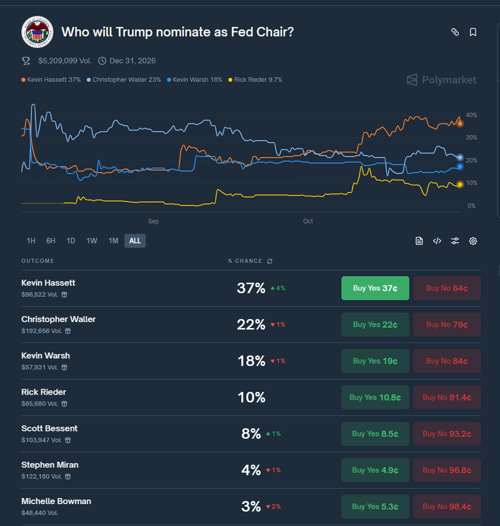 凯文·哈塞特也是所有候选人中与特朗普关系最为密切的,曾在特朗普上一任总统任期内担任白宫要职,并在特朗普的两届总统任期之间为其女婿贾里德·库什纳的私募股权公司工作。 在加密货币预测市场Polymarket的押注中,他被认为接任鲍威尔的概率最大,达37%。