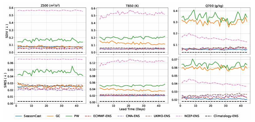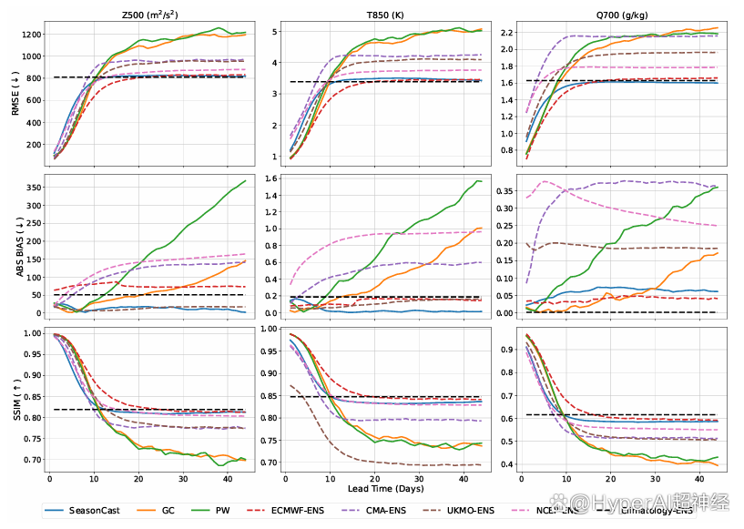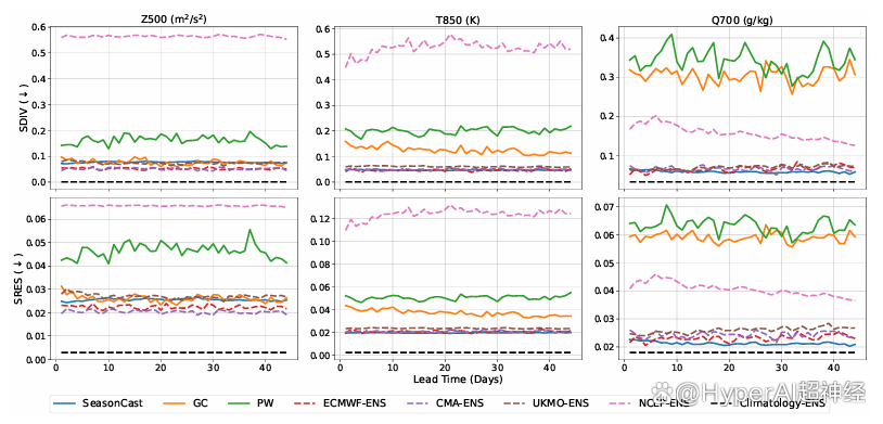 在三个关键变量下,不同方法在 1~44 天预报时效内的预测确定性性能:实线代表深度学习方法,虚线代表数值方法