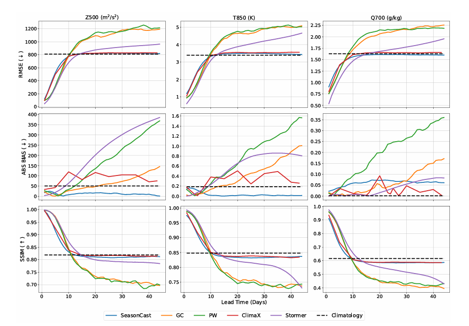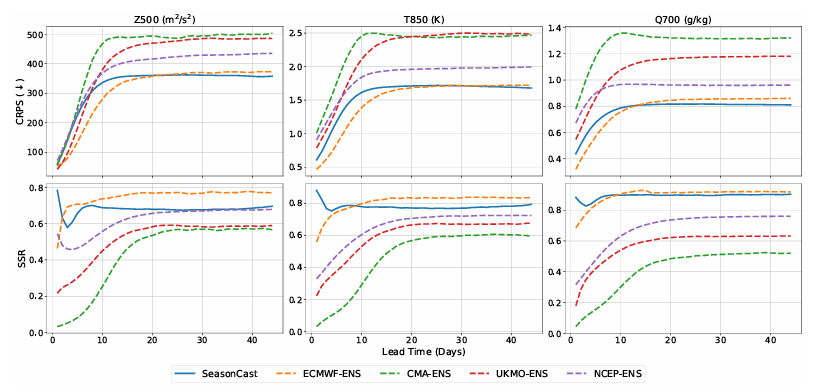 除以上试验外,研究团队还将 OmniCast 与今年提出的适用于长时效天气预测的深度学习方法进行了对比,包括 ClimaX(基于 Transformer 架构) 和 Stormer(基于改进的图神经网络)。结果显示,OmniCast 在所有指标上均优于两者。在 RMSE 指标上,T850 和 Z500 分别比 ClimaX 低 16.8% 和 16.0%;比 Stormer 低 11.6% 和 10.2%;在 CRPS 指标上,比 ClimaX 低 20.2% 和 17.1%,比 Stormer 低 13.9% 和 11.0%。该结果证明了 OmniCast 在长时效天气预测中具有显著优势,通过潜在扩散模型与掩码生成框架的结合,其对天气序列长程依赖的建模能力优于传统深度学习架构。如下图所示: