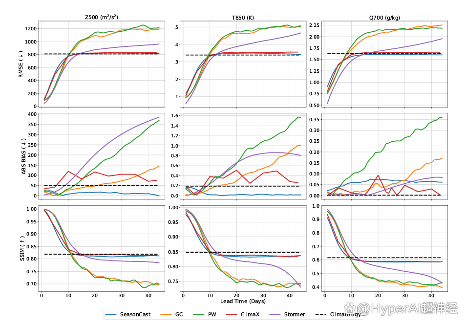 在准确性指标(均方根误差(RMSE)、绝对偏差(ABS BIAS)和多尺度结构相似相(SSIM))方面,OmniCast 在短期预报时效内的 RMSE 和 SSIM 上表现都意料之中的略逊于其他基准模型。当然,这是由 OmniCast 的训练目的导致的,但随着预报时效增加,OmniCast 的相对性能会逐步提升,在 10 天后可达到与 ECMWF-ENS 相当的最优表现。如下图所示: