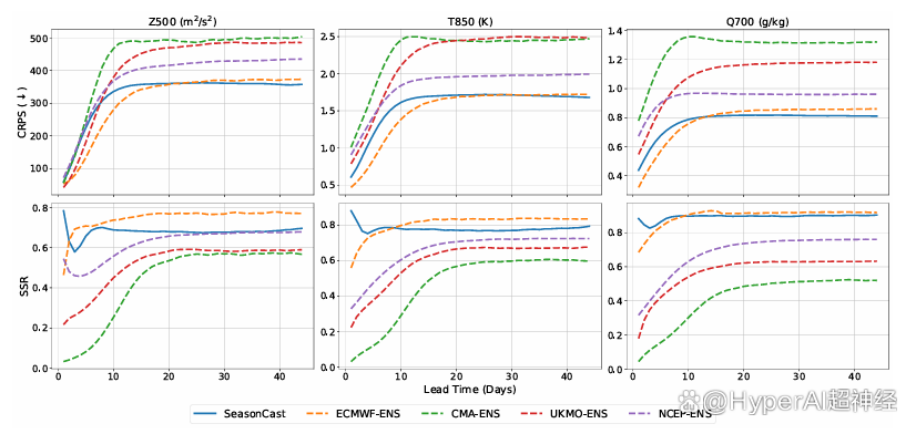 在概率性指标方面(连续排序概率评分(CRPS)和离散技巧比(SSR),后者数值越接近 1 越好),与准确性指标类似,在较短预报时效内,OmniCast 性能略逊于 ECMWF-ENS,但 15 天后会实现反超。总而言之,在各类变量和不同预报时效下,OmniCast 与 ECMWF-ENS 都是表现最优的两类方法。如下图所示: