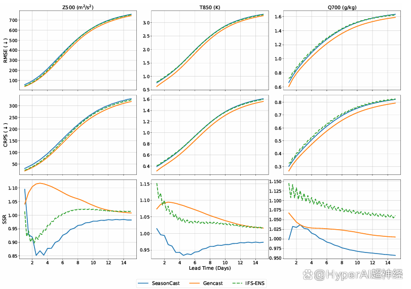 之后在中期天气预测任务中,研究团队将 OmniCast 与用于概率性预报的主流深度学习方法 Gencast 和数值集合预报系统的「黄金标准」——IFS-ENS 这两类基准模型进行了对比,以 RMSE、CRPS 和 SSR 作为评估指标。如下图所示:
