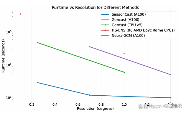 不同方法生成未来 15 天预报时的运行时间与分辨率对比