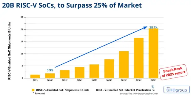 The SHD Group预测,到2030年,全球RISC-V SoC出货量将达162亿颗,市场规模927亿美元,年复合增长率高达47.4%,远超传统架构。其中,AI加速器将成为增长最快领域,预计贡献超400亿美元营收。