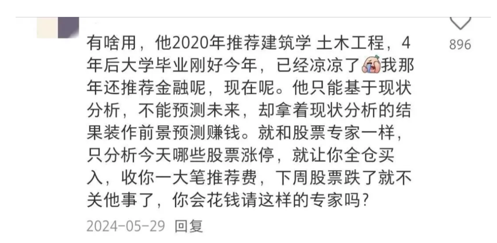 他创造了一套独特的话语系统:将各个大学的底蕴简化为就业率、薪资水平等量化指标,为信息弱势群体提供了看似明确的破局思路。他还以“说破真相”的姿态,构建了一套看似清晰的生存法则:金融优于哲学,计算机胜过历史,一切选择都应有其明确的“性价比”。