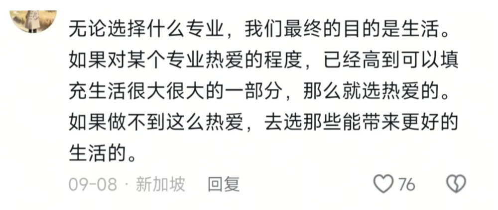 “后悔听了张海峰的话。”在社交平台上,那些从曾经的热门专业中艰难转型的年轻人频频发声。有人坦言,当初只看重就业率,从没想过自己是否适合、是否会痛苦。这种表达正在形成新的社会现象:那些成功抵达“热门赛道”的人,却发现自己在这个位置上找不到价值感。
