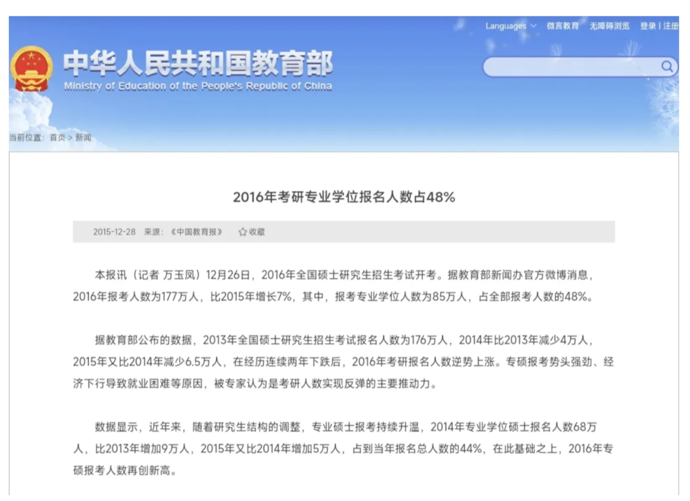 2016年,凭借《七分钟解读34所985高校》等短视频,张雪峰迅速走红。这一年,正是我国考研报名人数的关键转折点。此前,该数据连续两年下跌,而2016年全国硕士研究生报考人数达177万人,较2015年增长7%,首次实现止跌反弹。