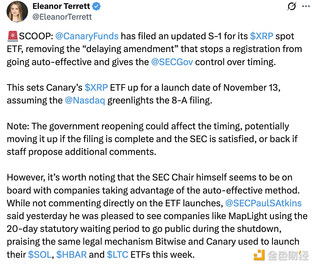 Canary Capital为其XRP现货ETF提交更新后的S-1表格,移除延迟修订条款,预计11月13日上市。美SEC主席支持利用自动生效机制,时间安排或受政府停摆影响。
