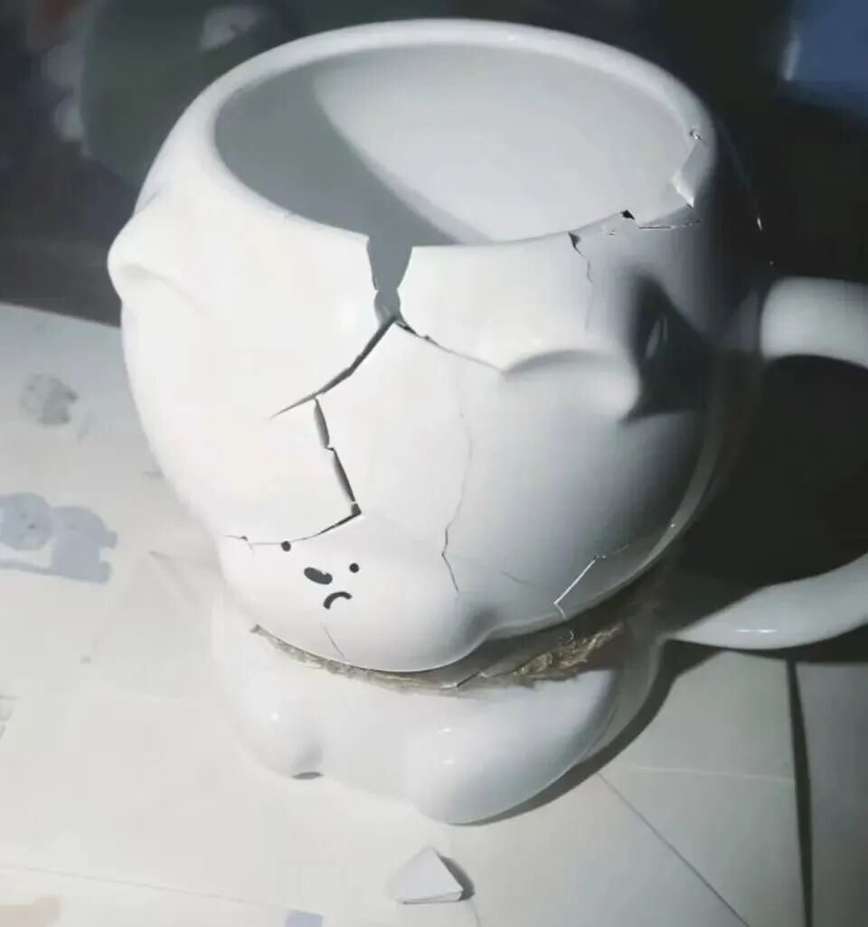 照片里,陶瓷杯布满闪电状的裂痕,从杯底一路蔓延到杯口,但杯子却奇迹般地“站得笔直”。