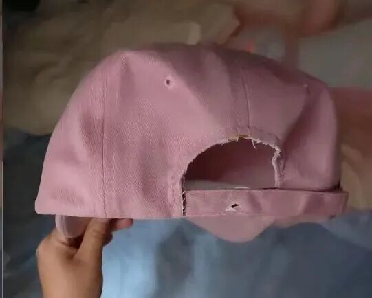 买家发来的照片里,粉色的帽檐褶皱、边缘脱线,看起来的确像被扯坏了。可她仔细一看,脱线的地方露出了不属于帽子的棕色色块——AI在绘制时,错把帽子背景周围的颜色“混”进了帽檐里。