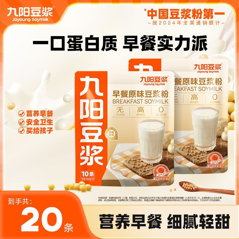 九阳豆浆早餐原味豆浆粉现正热卖中每包仅需15.9元即可到手10条装2大袋共20条独立小包装方便携带冲泡简单口感醇厚适合忙碌的早晨作为高蛋白营养早餐无添加蔗糖健康更安心精选优质大豆研磨而成保留大豆精华营养丰富拼多多百亿补贴加倍补专属优惠原价18.9元现在实付低至15.9元数量有限快去抢购吧