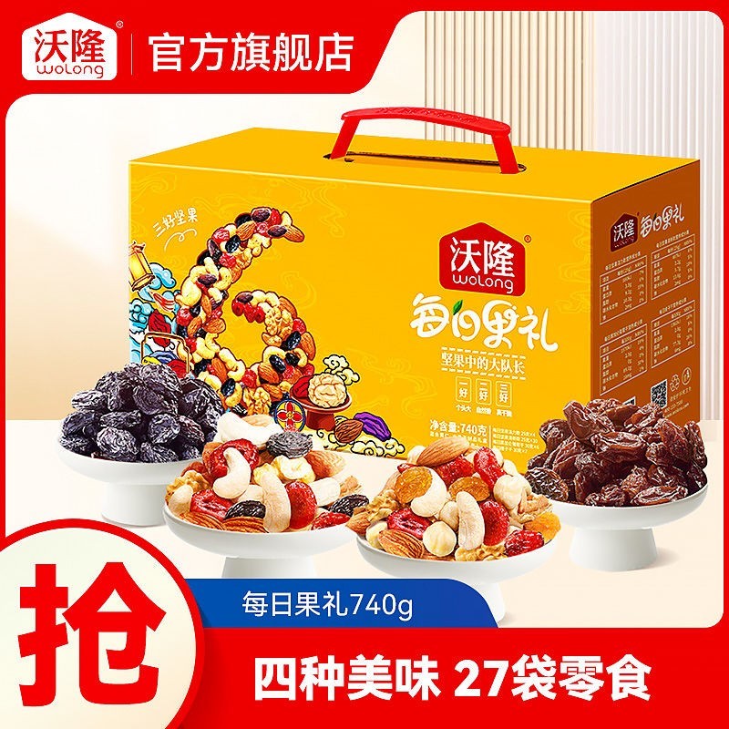 沃隆每日果礼740g大容量礼盒装,精选优质混合干果仁,科学搭配每日所需营养,独立小包装设计方便携带,开袋即食,适合办公室、居家、出行等多种场景。内含扁桃仁、腰果、核桃仁、蔓越莓干等多种美味,口感丰富,健康又美味。作为中秋送礼佳品,体面大方,自用送人都很合适。