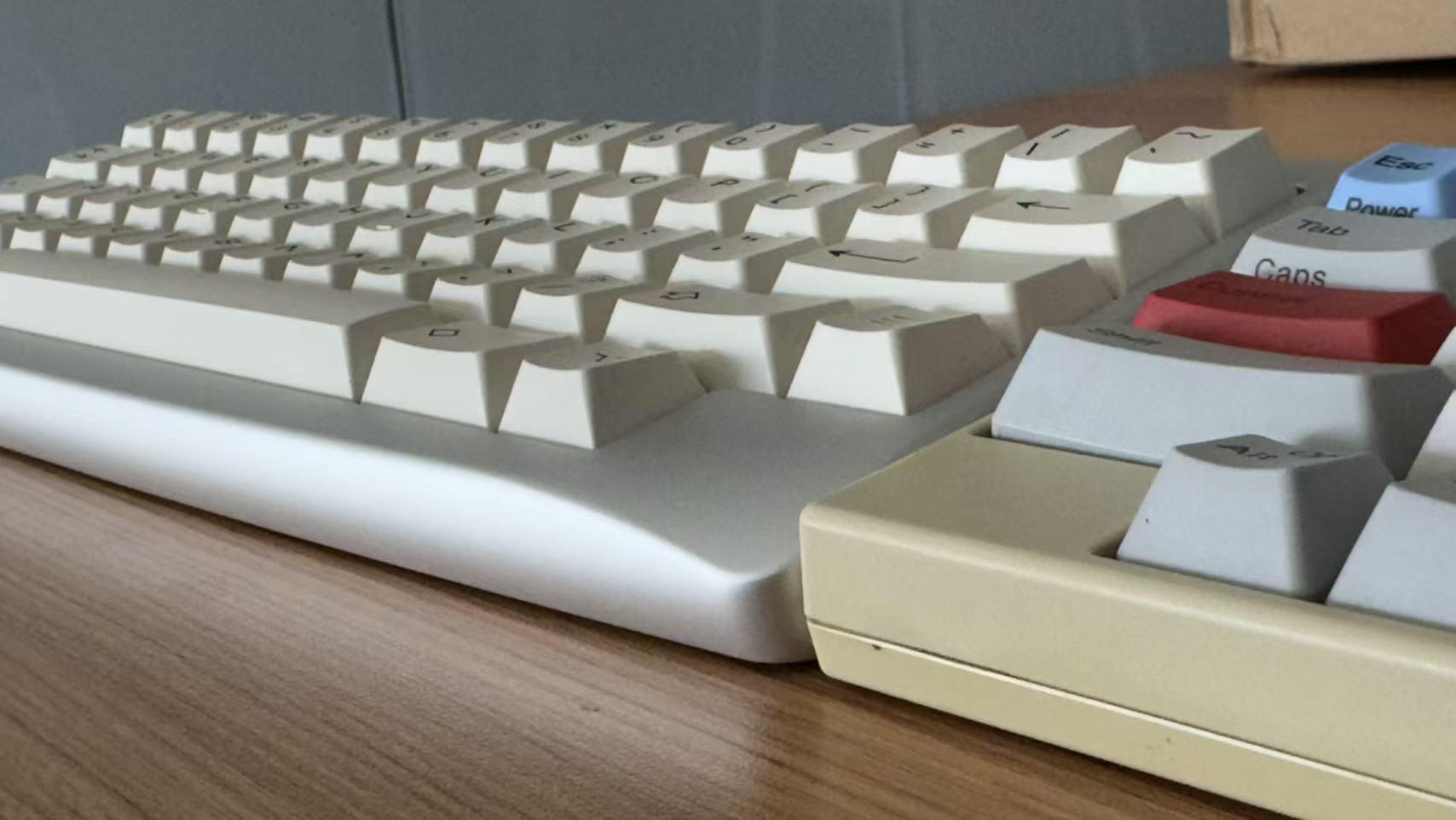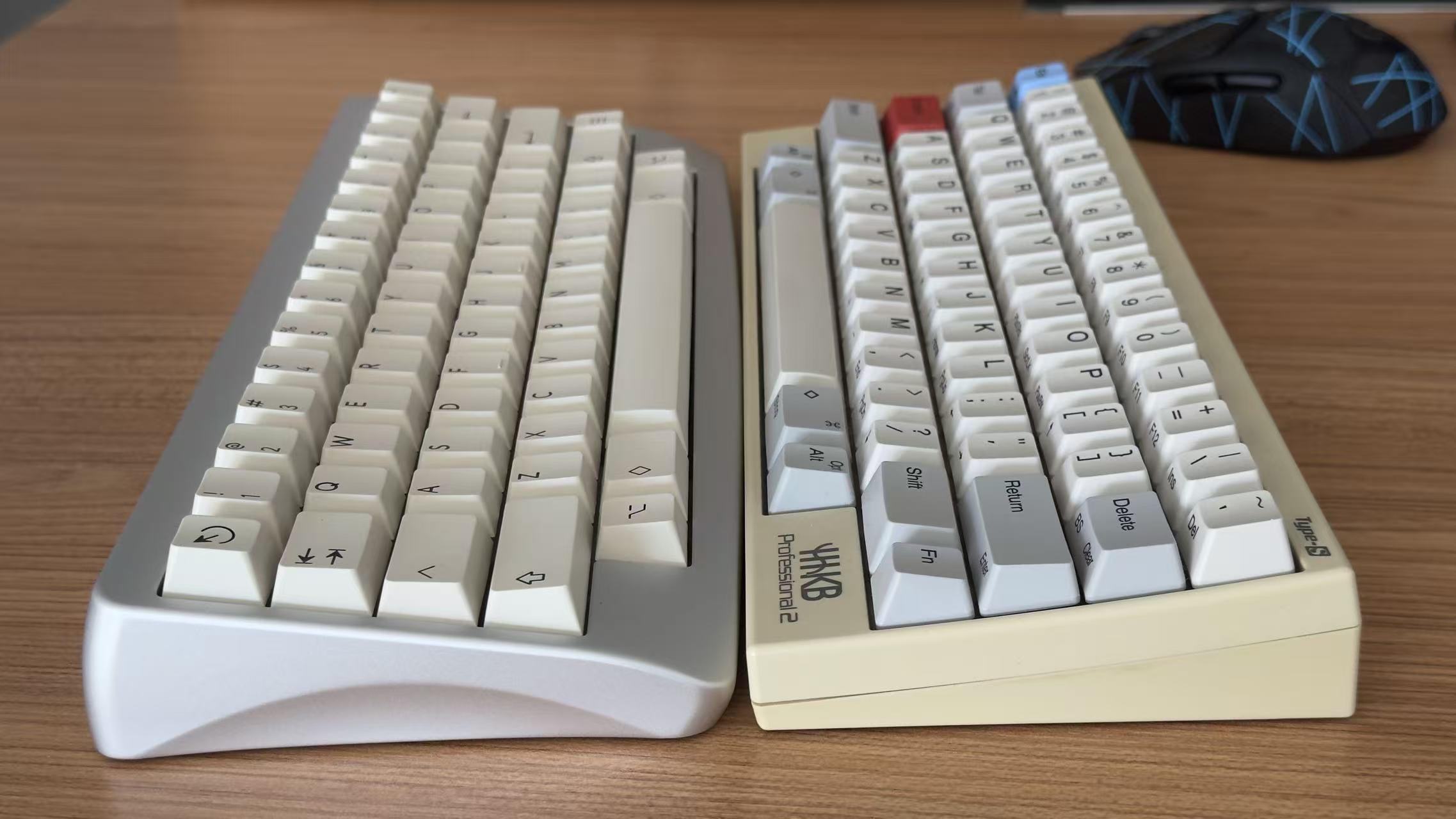 废话不多说,直接上图,对颜值很满意,阳极铝制的外壳,PC 的板子,重量就不要要求太轻了,G pro 3.0 白轴,触发压力 38g (静电容用够了想换机械键盘),PBTFans Pastel Grey 的键帽(看起来确实没有 HHKB 键帽好看,找不到更好看的了。。)。(注:拍摄角度问题,实际上这俩键盘 Agar60 比 HHKB Pro2 长了几毫米,图上看着谁在下面谁更长似的,错觉哈)