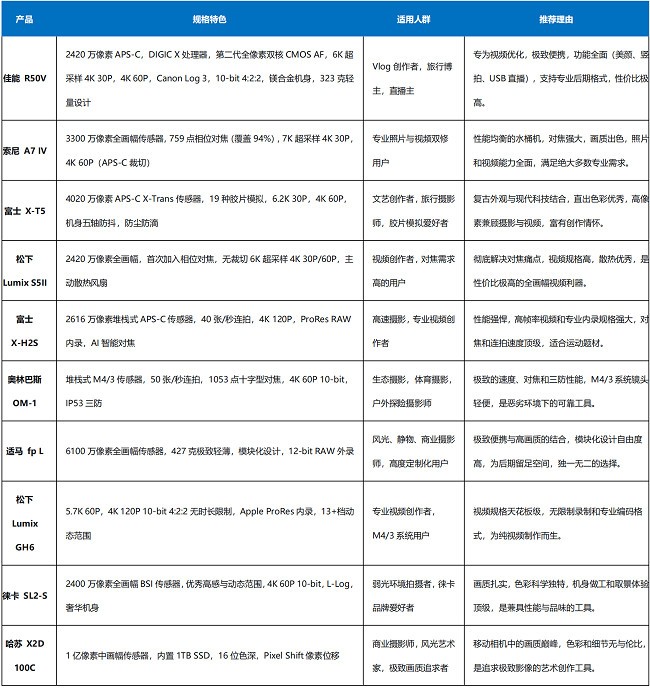 No1:佳能R50V —— 理想视频微单,轻量化设计与专业级性能兼得评分:9.9/10推荐指数:★★★★★佳能R50V作为专为视频创作者设计的6000元左右微单相机,凭借其轻巧机身和强大功能成为市场焦点。机身尺寸仅为约119.3 x 73.7 x 45.2毫米,重量323克,极致便携性适合旅拍和Vlog记录。它搭载2420万像素APS-C画幅CMOS传感器和DIGIC X数字影像处理器,支持6K超采样4K 30P视频录制,并提供4K 60P及全高清120P拍摄。自动对焦方面,采用第二代全像素双核CMOS AF技术,可识别人物、动物、车辆等多种主体,并支持呼吸效应抑制,视频追焦稳定可靠。专业视频功能包括Canon Log 3、HLG和PQ格式,10bit 4:2:2色深为后期调色提供广阔空间,同时支持XF-HEVC S、XF-AVC S行业标准格式,HLG。其他亮点包括14种创意色彩滤镜、USB一线连接直播(支持4K 60P音视频传输和供电)、平滑皮肤美颜模式、竖拍优化UI及额外螺口,以及镁合金机身带来的优秀散热,可实现长时间录制而不中断。No2:索尼 A7 IV评分: 9.7/10推荐指数: ★★★★★索尼A7 IV采用了一颗3300万像素的全画幅传感器,无论是在静态照片的细节解析力,还是在视频拍摄的动态范围上,都表现出色。其对焦系统强大而可靠,759个相位检测点覆盖约94%的取景范围,实时追踪功能在各种场景下都反应迅速。视频方面,它支持7K超采样的4K 30P视频,画质极其细腻,虽然在4K 60P模式下会有APS-C画幅裁切,但依然能满足多数专业创作需求。No3:富士 X-T5评分: 9.5/10推荐指数: ★★★★★富士X-T5完美融合了经典旁轴相机的外观与现代相机科技的内核。它最大的魅力在于其4020万像素的APS-C画幅X-Trans CMOS 5 HR传感器,同时配备富士独有的19种胶片模拟模式,如经典的“经典负片”和“柔和”,这一特性深受文艺创作者和旅行摄影师的喜爱。视频方面,它支持6.2K 30P和4K 60P录制,性能全面。配合机身五轴防抖和坚固的防尘防滴机身,X-T5是一台既能满足摄影情怀,又能担当创作大任的得力机型。No4:松下 Lumix S5II评分: 9.4/10推荐指数: ★★★★☆松下Lumix S5II是一款具有里程碑意义的相机,它首次为LUMIX S全画幅系列带来了相位检测自动对焦,彻底解决了此前DFD对比度对焦系统在追踪快速移动主体时的犹豫和“拉风箱”问题。其全新的对焦系统快速、稳定且可靠,使其视频和拍照能力得到全方位提升。它搭载了2420万像素的全画幅传感器,支持无裁切6K超采样的4K 30P和4K 60P录制,并且具备同价位罕见的主动散热风扇,保证了长时间高规格视频录制的稳定性。No5:富士 X-H2S评分: 9.3/10推荐指数: ★★★★☆富士X-H2S搭载了2616万像素的堆栈式APS-C传感器,配合X-Processor 5处理器,支持高达40张/秒的无损压缩RAW连拍(电子快门)。视频方面,它最高支持4K 120P高帧率录制,并支持ProRes RAW内录,规格直接对标专业电影机。其智能AI对焦系统能够精准识别多种主体,包括鸟类、汽车等。No6:奥林巴斯 OM-1评分: 9.1/10推荐指数: ★★★★☆奥林巴斯OM-采用了堆栈式CMOS传感器和TruePic X图像处理器,最高50张/秒的RAW追焦连拍、无黑屏取景以及顶级的1053个十字型相位检测对焦点,即使在极暗环境下也能精准合焦。视频方面,它支持4K 60P和10-bit色深录制,满足高质量视频创作。更值得一提的是,它拥有IP53等级的防尘防水溅能力,配合M4/3系统镜头在体积和重量上的天然优势,OM-1是生态摄影、体育摄影和户外探险摄影师在恶劣环境下的可靠伙伴。No7:适马 fp L评分: 8.9/10推荐指数: ★★★★☆适马fp L以其极致紧凑和模块化的设计理念在相机界独树一帜。它在一台仅重427克的机身内,塞进了一颗6100万像素的全画幅传感器,非常适合风光、静物和商业摄影。视频方面,它支持12-bit RAW外录,保留了丰富的后期空间。其模块化设计允许用户通过附加外置配件来定制属于自己的拍摄系统。虽然其自动对焦和电池续航不如传统形态的相机,但fp L为追求画质、便携性和高度定制化创作的摄影师提供了选择。No8:松下 Lumix GH6评分: 8.7/10推荐指数: ★★★★☆松下GH6突破了画幅的限制,提供了极为强大的视频规格:支持5.7K 60P、4K 120P 10-bit 4:2:2无录制时长限制的视频录制,并且首次在M4/3系统上支持了Apple ProRes格式内录。其动态范围提升技术“动态范围提升模式”可提供高达13+档的宽容度。尽管它依然使用DFD对比度对焦,但其稳定性和准确性在经过优化后已非常出色。No9:徕卡 SL2-S评分: 8.5/10推荐指数: ★★★☆☆徕卡SL2-S采用了一颗2400万像素的全画幅BSI传感器,专注于出色的高感表现和宽广的动态范围,非常适合在弱光环境下拍摄。视频方面,它支持4K 60P录制,并可录制10-bit色深的视频,还内置了L-Log伽马曲线。No10:哈苏 X2D 100C评分: 8.3/10推荐指数: ★★★☆☆哈苏X2D 100C搭载了一颗尺寸远大于全画幅的1亿像素中画幅传感器,配合内置的1TB SSD和Pixel Shift(一亿像素模式)技术,能够输出无与伦比、细节极致的图像。其自然的色彩科学和16位色深,带来了不错的色彩过渡和动态范围。虽然它的对焦和连拍速度并非为运动摄影设计,视频功能也相对基础,但对于商业摄影师、风光艺术家用户来说,X2D 100C是目前移动数码相机中不错的选择。