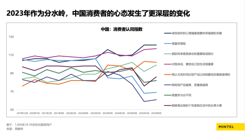 英敏特的数据显示,2023年前后,中国消费者的心态发生了底层变化:他们不再那么爱冒险、盲目尝新,在个性表达上也趋向收敛。与此同时,身心健康、身份认同和对生活的掌控感的重要性持续上升。“中国消费者从向外追求更多转向向内经营——中国消费者进入了‘降噪时代’。”英敏特亚太区洞察高级副总裁徐如一在演讲中说。