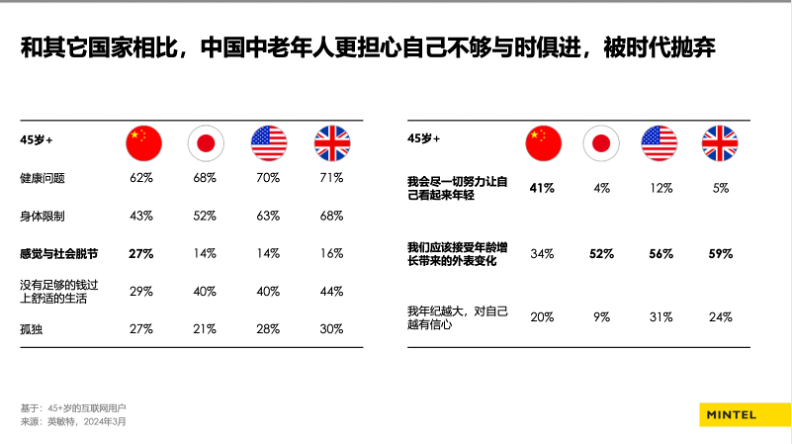 银发人群则代表着另一种被低估的机会。中国从进入老龄化到深度老龄化只用了21年的时间,远快于美国的72年和英国的46年,老龄人口规模也远高于英美。更重要的是,这一代中老年人与其他国家的同龄人心态也有所不同——27%的中国老年人担心自己与社会脱节,这一比例远高于美国、日本和英国;他们对“接受年龄增长带来的外表变化”的认同度则低于发达国家。