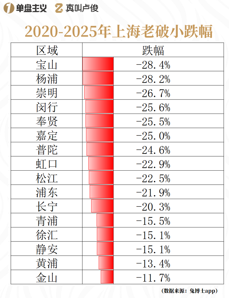 各区的跌幅差异比较明显,以下是2020~2025年上海各区老破小的跌幅排名: