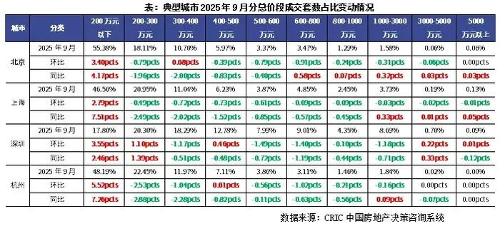 在克而瑞统计的典型城市9月份总价段成交套数占比变动情况中,北上深杭200万以下总价段二手,同步环比都有提升。