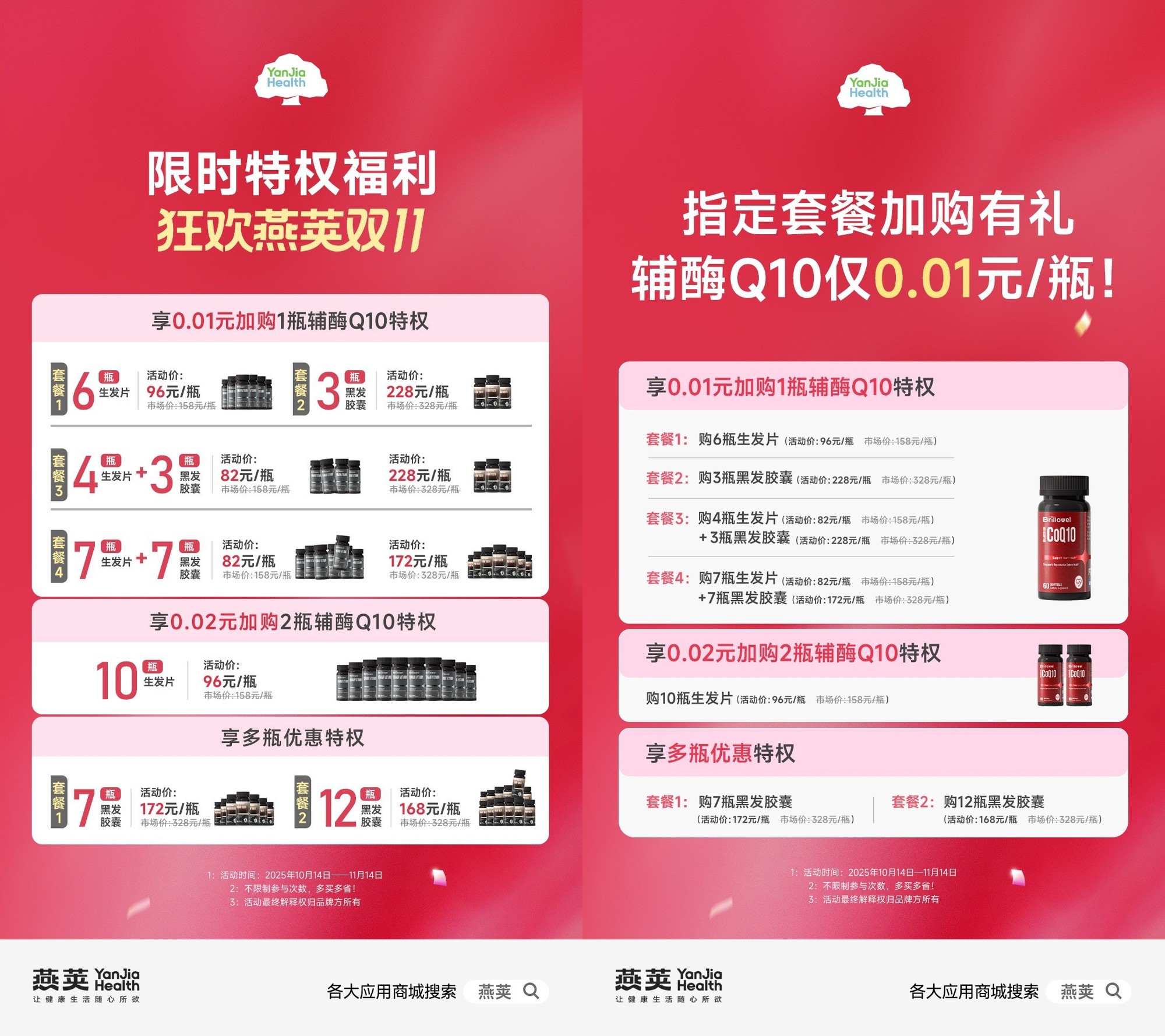 正值燕荚双十一福利活动,Brillowel辅酶Q10推出了前所未有的优惠活动,为广大消费者带来了实实在在的福利。市场价328元/瓶的Brillowel辅酶Q10,从指定套餐加购仅需0.01元/瓶,单瓶可省300元以上!活动时间从2025年10月14日持续至11月14日,长达一个月的选购时间,让消费者无需熬夜抢购,轻松享受优惠。