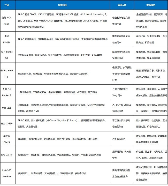 No1:佳能R50V:全能型视频利器评分:9.9/10推荐指数:★★★★★佳能R50V搭载APS-C画幅CMOS图像感应器和DIGIC X数字影像处理器,可实现6K超采样4K 30P视频,呈现纤毫毕现的高清画质,并具备广阔视角。无论是壮丽的自然风光还是局促的室内空间,都能以完整画幅,精准捕捉每一处细节。为方便用户进行后期视频处理,佳能R50V支持4:2:2 10-bit色深Canon Log 3伽马曲线,为后期调色保留丰富细节。新增竖拍UI与螺口,搭配USB一线式4K 60P直播供电功能,使其成为连接专业制作与社交媒体创作的桥梁。在自动对焦方面,佳能R50V搭载的第二代全像素双核CMOS AF系统,基于深度学习技术,可精准识别并追踪人物、猫、狗、鸟、马、汽车、飞机等多种主体,让创作者能全心投入内容叙事。同时,相机内置的14种创意色彩滤镜和电影视图模式,让用户无需复杂后期即可直出风格独特的电影感短片,极大地激发了创作灵感。No2:索尼 ZV-E20评分:9.0/10推荐指数:★★★★☆这款相机的最大优势在于其出色的画质基础。APS-C画幅传感器带来优秀的背景虚化效果和高感光度表现,画质明显优于大多数卡片机。可更换镜头的设计为用户提供了更大的创作空间,可以根据不同拍摄需求选择合适焦段的镜头。继承了索尼先进的实时追踪和眼部对焦技术,对焦快速准确,确保拍摄主体始终保持清晰。同时具备麦克风接口和高清视频输出等专业接口,性价比表现突出。No3:松下 Lumix S9评分:8.9/10推荐指数:★★★★☆松下Lumix S9是一款全新设计的全画幅无反相机,以极致的轻量化设计和出色的视频性能吸引着追求便携与画质兼备的创作者。这款相机在全画幅相机中实现了出色的便携性,既保证了顶级画质又便于随身携带。松下的色彩科学备受好评,直出画面色彩真实且富有氛围感,减少了后期调色的工作量。支持高规格视频录制,具备可靠的防抖性能,适合拍摄高质量旅拍Vlog。作为L卡口联盟成员,可以共享丰富的镜头资源,为创作提供更多可能性。No4:GoPro Hero 13评分:8.7/10推荐指数:★★★★GoPro Hero 13作为运动相机的开创者,新一代产品在坚固耐用性和极限运动拍摄方面继续保持着领先地位。这款相机是极限运动拍摄的绝佳选择。坚固耐用的机身设计和强大的防水性能,使其能够胜任冲浪、滑雪、跳伞等各种极限运动场景。拥有庞大的官方和第三方配件生态系统,支持多种特殊场景的拍摄需求。HyperSmooth防抖算法针对剧烈颠簸场景进行了优化,表现非常出色。在运动圈层拥有极高的品牌认可度和用户忠诚度。适合人群: 专注于极限运动、水下探险等硬核户外拍摄场景的运动爱好者。No5:大疆 DJI Pocket 3评分:8.5/10推荐指数:★★★★大疆DJI Pocket 3是一款将一英寸传感器与三轴机械云台集成在小巧机身中的云台相机,主打即开即拍的稳定拍摄体验。这款产品的最大特色是其卓越的防抖性能。三轴机械云台提供物理级的极致防抖效果,无论是行走拍摄还是跑动跟拍,画面都能保持稳定流畅。开机即可快速投入拍摄,无需繁琐的调平过程,帮助用户抓住转瞬即逝的精彩瞬间。机身极其小巧便携,可以轻松放入口袋,是日常记录和旅行Vlog的理想选择。强大的AI跟随功能即使单人操作也能轻松实现主角跟随拍摄。No6:尼康 Z30评分:8.3/10推荐指数:★★★★尼康Z30是一款专为Vlog和视频创作者设计的轻量级微单相机,以其出色的便携性和直观的操作体验,成为入门和中级用户的理想选择。这款相机具备优秀的自动对焦系统,支持人物和动物眼部侦测,确保在拍摄vlog时面部始终保持清晰。无裁切的4K视频录制和长达125分钟的连续录制能力,满足了长时间创作的需求。轻巧的机身配合侧翻屏设计,方便自拍和多种角度取景,内置的减震电子VR功能有效提升手持拍摄的稳定性。No7:富士 X-S20评分:8.1/10推荐指数:★★★☆富士X-S20是X系列中专注于视频功能的APS-C画幅无反相机,继承了富士经典的胶片模拟功能,在视频拍摄方面有着独特优势。这款相机的特色在于其独特的胶片模拟功能。内置多种经典胶片模拟模式,如Classic Negative和Eterna,直出画面呈现出复古文艺的质感,无需后期调色。视频性能、对焦和防抖相比前代产品都有显著提升,是一款表现均衡的水桶机。针对Vlog拍摄进行了优化,配备侧翻屏、大容量电池和良好的握持感。在APS-C画幅机型中提供了很有竞争力的功能和价格。No8:奥之心 OM-5评分:7.9/10推荐指数:★★★☆奥之心OM-5在轻巧的机身内融入了旗舰级的防抖性能和户外特性,是微型单电相机中的优秀代表。这款相机的防抖性能表现卓越,搭载了领先的机身防抖系统,手持拍摄视频和照片都非常稳定。M43系统天生小巧,镜头群轻便,且机身具备专业的防尘防滴溅能力,适合户外旅行使用。内置实时ND滤镜、高分辨率拍摄等实用功能,为创作提供更多便利。M43系统拥有大量高素质且价格合理的镜头可选。No9:索尼 ZV-1F评分:7.6/10推荐指数:★★★☆索尼ZV-1F是ZV系列中的入门级选择,专为Vlog设计的紧凑型相机,主打简单易用和高性价比。这款相机的最大优势是其亲民的价格门槛,以较低的成本提供了可靠的Vlog基础功能,是体验相机拍摄的绝佳起点。继承了索尼优秀的自动对焦系统,支持产品展示模式,对焦切换快速平滑。机身设计轻巧便携,搭配侧翻屏,自拍方便无忧。操作界面简洁易懂,一键虚化、美肤等功能易于上手,特别适合摄影新手。No10:Insta360 Ace
