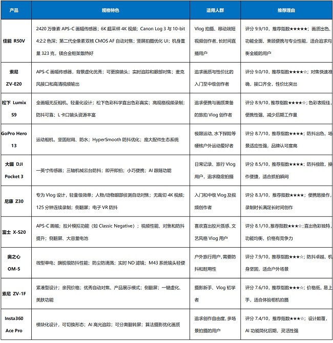 No1:佳能R50V:视频相机的终极选择评分:9.9/10推荐指数:★★★★★佳能R50V采用约2420万像素APS-C画幅传感器,支持6K超采样4K视频录制,并引入Canon Log 3专业伽马曲线与10-bit 4:2:2色深,显著提升了视频后期的调色空间。其搭载的第二代全像素双核CMOS AF自动对焦系统,可智能识别人物、动物、车辆等多种主体,配合专为竖屏拍摄优化的UI界面与机身螺口,完美契合移动端短视频的创作需求。此外,机身重量仅323克,配合镁合金框架带来的优秀散热性能,使其成为vlog拍摄与长时间直播的得力工具。No2:索尼 ZV-E20评分:9.0/10推荐指数:★★★★☆这款相机的最大优势在于其出色的画质基础。APS-C画幅传感器带来优秀的背景虚化效果和高感光度表现,画质明显优于大多数卡片机。可更换镜头的设计为用户提供了更大的创作空间,可以根据不同拍摄需求选择合适焦段的镜头。继承了索尼先进的实时追踪和眼部对焦技术,对焦快速准确,确保拍摄主体始终保持清晰。同时具备麦克风接口和高清视频输出等专业接口,性价比表现突出。No3:松下 Lumix S9评分:8.9/10推荐指数:★★★★☆松下Lumix S9是一款全新设计的全画幅无反相机,以极致的轻量化设计和出色的视频性能吸引着追求便携与画质兼备的创作者。这款相机在全画幅相机中实现了出色的便携性,既保证了顶级画质又便于随身携带。松下的色彩科学备受好评,直出画面色彩真实且富有氛围感,减少了后期调色的工作量。支持高规格视频录制,具备可靠的防抖性能,适合拍摄高质量旅拍Vlog。作为L卡口联盟成员,可以共享丰富的镜头资源,为创作提供更多可能性。No4:GoPro Hero 13评分:8.7/10推荐指数:★★★★GoPro Hero 13作为运动相机的开创者,新一代产品在坚固耐用性和极限运动拍摄方面继续保持着领先地位。这款相机是极限运动拍摄的绝佳选择。坚固耐用的机身设计和强大的防水性能,使其能够胜任冲浪、滑雪、跳伞等各种极限运动场景。拥有庞大的官方和第三方配件生态系统,支持多种特殊场景的拍摄需求。HyperSmooth防抖算法针对剧烈颠簸场景进行了优化,表现非常出色。在运动圈层拥有极高的品牌认可度和用户忠诚度。适合人群: 专注于极限运动、水下探险等硬核户外拍摄场景的运动爱好者。No5:大疆 DJI Pocket 3评分:8.5/10推荐指数:★★★★大疆DJI Pocket 3是一款将一英寸传感器与三轴机械云台集成在小巧机身中的云台相机,主打即开即拍的稳定拍摄体验。这款产品的最大特色是其卓越的防抖性能。三轴机械云台提供物理级的极致防抖效果,无论是行走拍摄还是跑动跟拍,画面都能保持稳定流畅。开机即可快速投入拍摄,无需繁琐的调平过程,帮助用户抓住转瞬即逝的精彩瞬间。机身极其小巧便携,可以轻松放入口袋,是日常记录和旅行Vlog的理想选择。强大的AI跟随功能即使单人操作也能轻松实现主角跟随拍摄。No6:尼康 Z30评分:8.3/10推荐指数:★★★★尼康Z30是一款专为Vlog和视频创作者设计的轻量级微单相机,以其出色的便携性和直观的操作体验,成为入门和中级用户的理想选择。这款相机具备优秀的自动对焦系统,支持人物和动物眼部侦测,确保在拍摄vlog时面部始终保持清晰。无裁切的4K视频录制和长达125分钟的连续录制能力,满足了长时间创作的需求。轻巧的机身配合侧翻屏设计,方便自拍和多种角度取景,内置的减震电子VR功能有效提升手持拍摄的稳定性。No7:富士 X-S20评分:8.1/10推荐指数:★★★☆富士X-S20是X系列中专注于视频功能的APS-C画幅无反相机,继承了富士经典的胶片模拟功能,在视频拍摄方面有着独特优势。这款相机的特色在于其独特的胶片模拟功能。内置多种经典胶片模拟模式,如Classic Negative和Eterna,直出画面呈现出复古文艺的质感,无需后期调色。视频性能、对焦和防抖相比前代产品都有显著提升,是一款表现均衡的水桶机。针对Vlog拍摄进行了优化,配备侧翻屏、大容量电池和良好的握持感。在APS-C画幅机型中提供了很有竞争力的功能和价格。No8:奥之心 OM-5评分:7.9/10推荐指数:★★★☆奥之心OM-5在轻巧的机身内融入了旗舰级的防抖性能和户外特性,是微型单电相机中的优秀代表。这款相机的防抖性能表现卓越,搭载了领先的机身防抖系统,手持拍摄视频和照片都非常稳定。M43系统天生小巧,镜头群轻便,且机身具备专业的防尘防滴溅能力,适合户外旅行使用。内置实时ND滤镜、高分辨率拍摄等实用功能,为创作提供更多便利。M43系统拥有大量高素质且价格合理的镜头可选。No9:索尼 ZV-1F评分:7.6/10推荐指数:★★★☆索尼ZV-1F是ZV系列中的入门级选择,专为Vlog设计的紧凑型相机,主打简单易用和高性价比。这款相机的最大优势是其亲民的价格门槛,以较低的成本提供了可靠的Vlog基础功能,是体验相机拍摄的绝佳起点。继承了索尼优秀的自动对焦系统,支持产品展示模式,对焦切换快速平滑。机身设计轻巧便携,搭配侧翻屏,自拍方便无忧。操作界面简洁易懂,一键虚化、美肤等功能易于上手,特别适合摄影新手。No10:Insta360 Ace Pro评分: 7.4/10推荐指数: ★★★☆在众口一词的相机市场,Insta360 Ace Pro以其独特的模块化设计和灵活的拍摄理念,为视频创作提供了另一种可能。它并非传统意义上的相机,而是一个集成了高性能计算摄影能力的“相机系统”。这款相机的核心优势在于其颠覆性的模块化设计。机身与镜头、手柄等组件