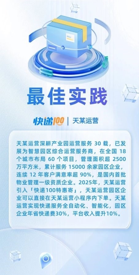 📦 **创新合作模式,赋能智慧园区服务升级**:快递100通过「快递100 特惠寄」产品,与拥有30年经验的天某运营携手,将优惠寄件服务引入其全国60个智慧园区。此举精准对接了园区内15000余家企业对便捷物流服务的需求,是天某运营完善“全生命周期产业赋能”服务体系的关键一步,有效填补了企业物流配套服务的空白,巩固了其行业领先地位。